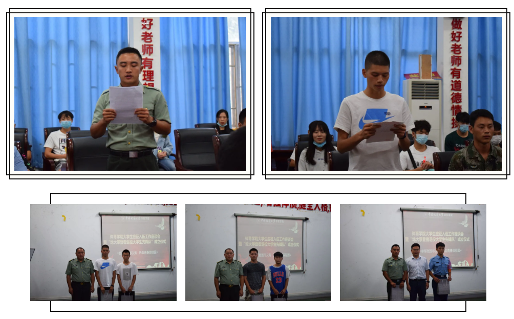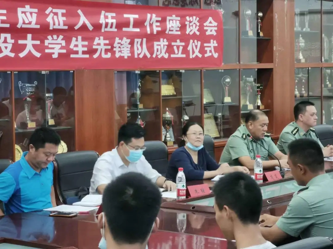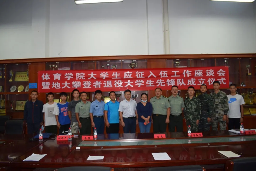 2020年9月10日15:00,公司在体育馆二楼会议室召开了太阳成集团tyc122cc老员工参军应征工作座谈会暨地大攀登者退役老员工先锋队成立仪式。出席此次会议的领导有武装部副部长单红峰,学工部副部长朱继,武装部老师魏刚,体育公司党总支书记庞岚,体育公司党总支副书记张延平。参与本次会议的人员有太阳成集团tyc122cc在校的退役老员工和2020年应征入伍员工,以及太阳成集团tyc122cc部分同学。会议由131181班的陈岳峰同学主持。