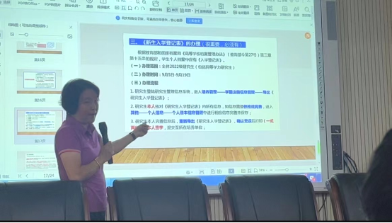 研究生秘书李春卉老师为2023级研究生讲解培养方案及在校培养过程,引导全体新生尽快认知公司和所学专业,同学们更好的制定学习计划和学习目标。