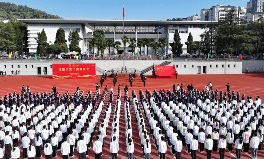 在校运会开幕式上,首项迎来的是一面极具特殊意义的国旗——它于2012年11月7日(122cc太阳成集团官网60周年校庆日)清晨在天安门广场升起,见证大国荣耀。经申请,天安门地区管理委员会于今年9月25日批准将此旗赠予公司。今日,全校师生肃立,共迎这面承载光荣与梦想的国旗冉冉升起。