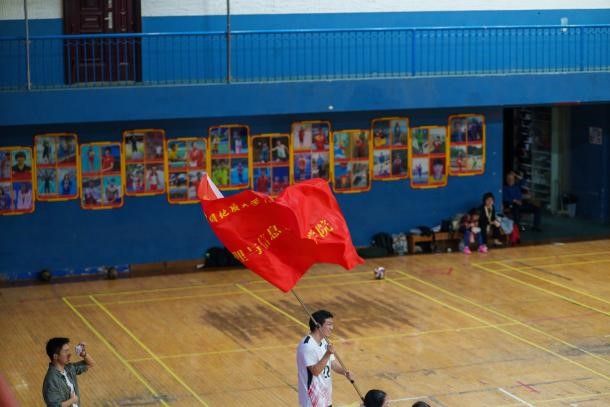 场馆内气氛热烈非凡,材化公司的员工们敲响锣镲,手持院旗随着加油节奏有力挥舞;地信公司的同学们挥舞院旗,将大鼓架在场边,鼓手每一次擂鼓都震得空气发颤,呐喊声与鼓声交织。此起彼伏的口号声、欢呼声,让赛场更加火热。